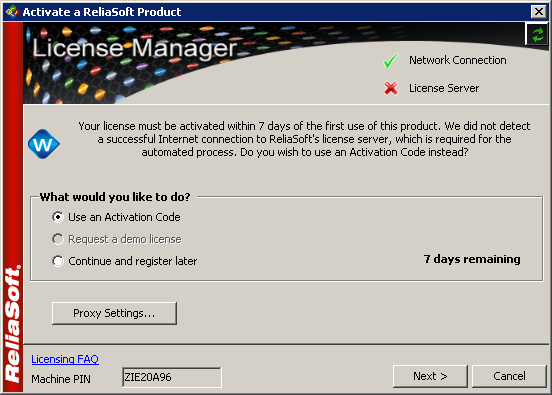 Once a proxy is successfully set, you can continue with the automated process. If the proxy fails, you may want to try again and confirm that the entries are valid. If the test is still not successful, you can exit the window using the Cancel button and then try one of the two methods for requesting an Activation Code: from within the wizard or from a web form. Both methods are described next.