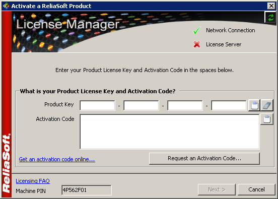The software will first attempt to communicate with the ReliaSoft License Server directly. At this time, it checks both your network connection and the ability to connect to our server. In the image below, the connection is detected (green check mark) but it is unable to communicate with our server (red X). (Note that some licenses require additional information, such as a Confirmation Key, password, user or seat information, etc. In such cases, you will not be able to obtain an Activation Code automatically. If you have trouble with the automatic process, you can refer to step 3 for instructions on obtaining a code manually.)