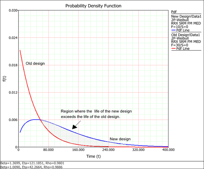 The result shows the following plot (with an area shaded to show the region where the life of the new design exceeds the life of the old design).
