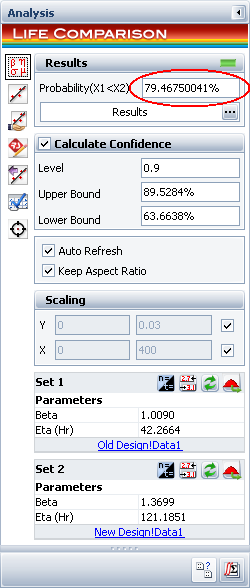 The result on the control panel indicates that the new design will last longer with a probability of 79.4675%, as shown next.