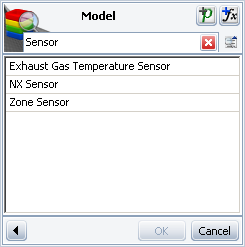You can filter the models that are displayed in the list by entering text in the Filter field (marked with a magnifying glass); clear the filter by clicking the Clear Filter icon in the field (red x). Select a model and click OK (or double-click it) to assign the model to the current location. If a model was already assigned, the newly selected model will replace it.