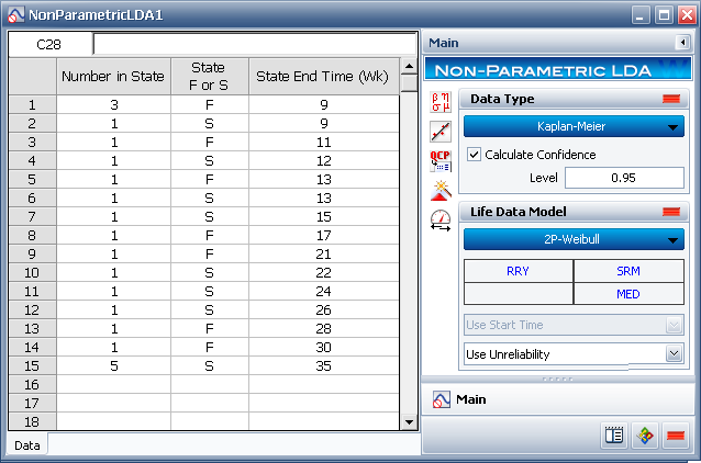 The non-parametric LDA folio will obtain the reliability estimates only for the failure times that were entered in the data sheet (in this example, it is for weeks 9, 11, 13, 17, 21, 28 and 30). In order to estimate (i.e., interpolate) the reliability of the product at other times, you will need to create a parametric model. To do this, make the following selections in the Life Data Model area of the control panel: