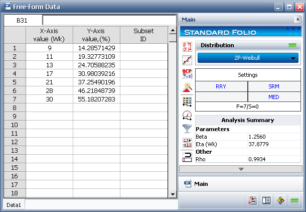 The data will be transferred to a free-form data sheet, where the failure time values will be copied to the “X-Axis value” column, and the unreliability values will be copied to the “Y-Axis value” column.
