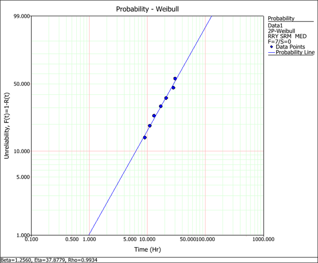 Next, click the Plot icon on the control panel. The following probability plot shows the probability line with respect to the values obtained from the non-parametric analysis. As you can see, the 2P-Weibull provides a good fit to the values.