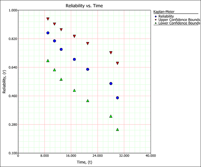 In the following example, the dots on the plot show the reliability estimates at each point of failure, the triangles show the lower 1-sided confidence bounds of the estimates, and the inverted triangles show the upper 1-sided confidence bounds. The pattern of the data points shows that the product exhibits a sharp decline in reliability over the course of a few weeks.