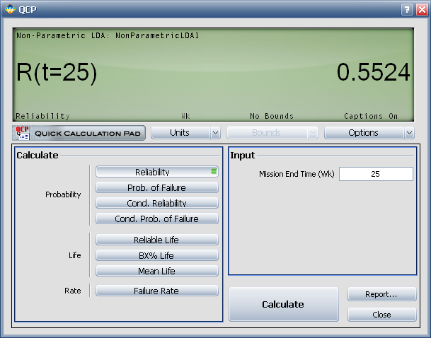 In the QCP, choose to calculate the Reliability. Select Week for the time units and then enter 25 for the mission end time. Click Calculate to display the results. The reliability is 55.24%, as shown next.