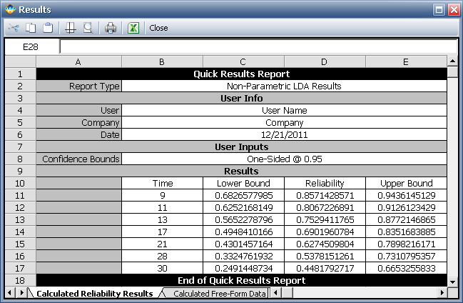 To view the calculated reliability values, click the Non-Parametric Results (...) button on the control panel to open the Results window, as shown next.