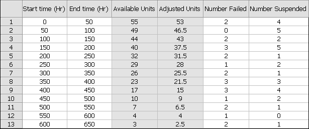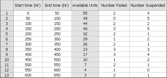 The data sheet contains information about the start time and end time of each interval, as well as the number of units in each interval that are either failures or suspensions. The Available Units column shows the number of units at the start of each interval. The information in this column is automatically calculated by the software based on all of the entries in the Number Failed and Number Suspended columns.