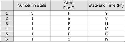 The Number in State column indicates the number of units in a group, the State F or S column indicates whether the units in the group are failures (F) or suspensions (S) and the State End Time column records the end time of the interval.