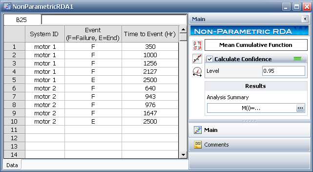 The System ID column identifies the system that experienced an event. In the sample data sheet, two units of the same type of motor are being tracked. These two systems will be treated as one group and the resulting mean cumulative function (MCF) will depict the average behavior of the group.