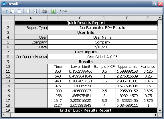 The Variance column indicates the amount of uncertainty in the MCF value. This is also used to obtain the 1-sided confidence bounds that are displayed in the Lower Limit and Upper Limit columns. These 3 columns are available only if you have selected the Calculate Confidence check box in the control panel and specified a confidence level.