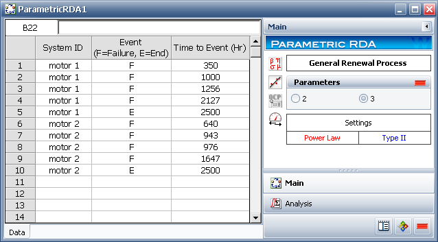 The System ID column identifies the system that experienced an event. In the sample data sheet, two units of the same type of motor are being tracked. These two systems will be treated as one group and results such as the mean time between failures (MTBF) and failure intensity will depict the average behavior of the group.