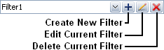 You can choose an existing filter from the drop-down list. To create a new filter, click the Create New Filter icon. To edit the filter that is currently being used, click the Edit Current Filter icon. To delete the filter that is currently being used, click the Delete Current Filter icon. This will delete the filter entirely; there is no undo for delete. If you want to keep the filter for future use and simply stop using it right now, choose a different filter from the drop-down list. The Default Filter option shows all project in the database.