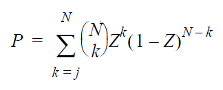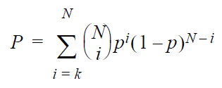 The Cumulative Binomial Probability option returns the probability of an event occurring k or more times in N trials. The required inputs are k, N and the probability (entered as a decimal number) of the event occurring per trial.