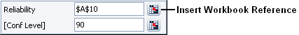 In this example, reliability is a required input and confidence level is an optional input, which is denoted by enclosing the input in brackets. You can enter values in these fields or click the Insert Workbook Reference icon to insert a reference to the cell currently selected in the sheet. Note that you can move the cursor in the sheet while the Function Wizard is open, which enables you to select any desired cell.