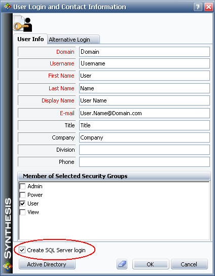 If you choose to create individual SQL Server logins for some or all of the Synthesis user accounts, you have two options: