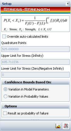 The Setup page contains options for setting how you want the probability value to be computed. The following picture shows the Setup page of a stress-strength folio.
