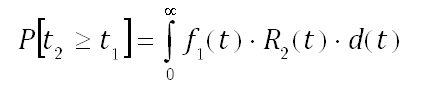 where f(t) is the pdf of product 1 and R(t) is the reliability function of product 2. The evaluation is based on whether this probability is less than or greater than 0.5. The result is interpreted as follows: