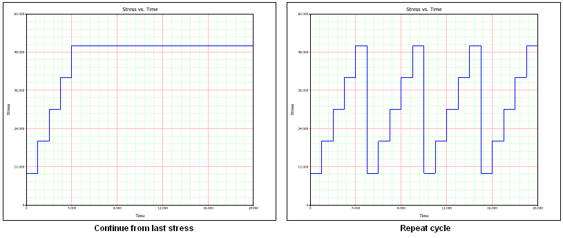 For example, suppose you defined a pattern that is made up of five segments, each an hour long and increasing stepwise from the segment before. The graphs below illustrate the difference between continuing from the last stress (left) and selecting to repeat (right). In this example, the test has a duration of 20 hours, and the graphs explain what would happen through the entire duration of the test.