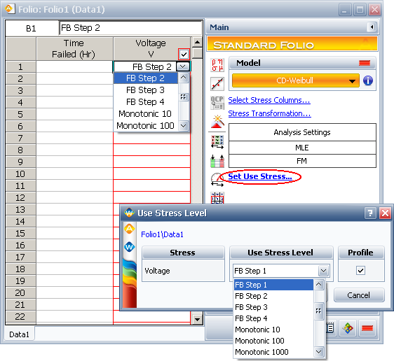 In the ALTA standard folio data sheet, each row represents a tested unit (or group of units). To choose the profile that describes the test conditions for a unit or group, first make sure a cumulative damage life-stress model is selected on the control panel. Then select the cell in the appropriate stress column for the unit or group. A drop-down list will appear in the cell. The list displays all the validated stress profiles in the currently active project.