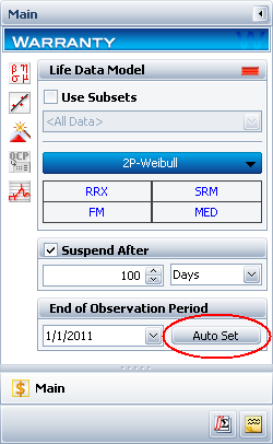 To automatically set the end date to the last day the warranty data were collected, click Auto Set, as shown next. This may be the latest date that appears on the Sales sheet or the latest date that appears on the Returns sheet, whichever is more recent.