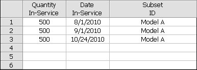 Note: For the column headings in this sheet, the general term in-service represents the closest estimate of the time at which each unit started operating in the field. For example, if you have access to both the manufacturing date and the shipping date for a group of parts, you may choose to perform the analysis based on the shipping date because it is a closer indicator of the time the product started operating in the field.