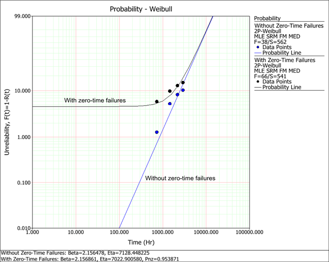 where R’(t) is the reliability function for the entire data set and R(t) is the reliability function for the data set without the zero-time failures. Therefore, when Pnz is equal to 1, all the failures are assumed to occur after time = 0.