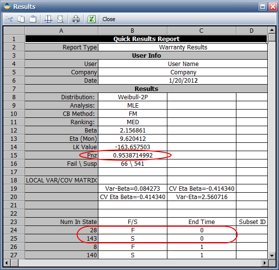 When you calculate the parameters and view the results in the Results window, the converted data set will contain a certain number data points with failures at time = 0, as shown next. Pnz represents the proportion of the population with non-zero failure times. In this sample report, the percentage of the population with non-zero failure times is approximately 95.3871%.