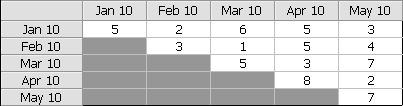 In this example, 5 units from the January sales were damaged during shipping and so were returned within the January sales period. These 5 failures will be treated as zero-time failures. In February, 3 units were also returned within the February sales period. These 3 failures are also zero-time failures. The rest of the chart can be read in a similar manner.