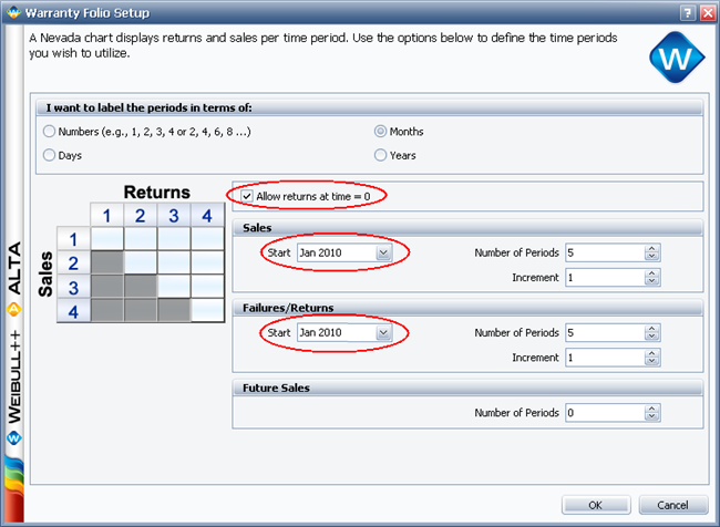 To include zero-time failures in the Nevada chart warranty analysis, select the check box during setup and set the return start date to be the same as the sales start date, as shown in the next example.