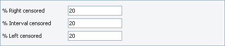 Random censoring: You provide percentages to specify what proportions of your total data points will consist of right censored, interval and left censored data. The remaining data points will be exact failure times. Thus, the sum of the three percentages entered cannot exceed 100%. This option can be useful for exploring how different kinds of uncertainty in your data can influence the results of an analysis.