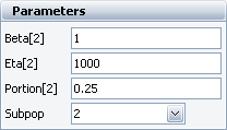 To specify the parameters for a subpopulation, select the subpopulation in the Subpop drop-down list, then enter the parameter values. Each input field will have a number in brackets to indicate which subpopulation that field is applicable to.