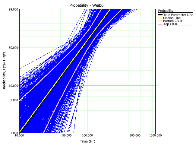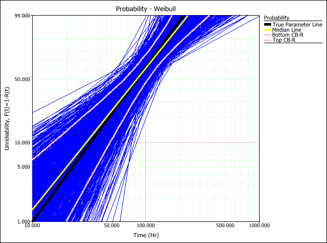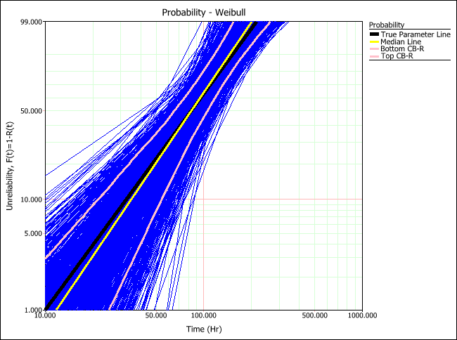 The true parameter line (black) shows the time vs. unreliability defined by the parameters of the distribution that was used to generated the simulated data. The median line (yellow) shows the time vs. unreliability defined by the median parameters of all generated data sets. By comparing these two lines, you can estimate how close the estimated parameters would be to product's assumed parameters (which you provided in the setup). The plots above show that RRX would provide the least deviation (i.e., "bias") from the truth for this sample size and data type.